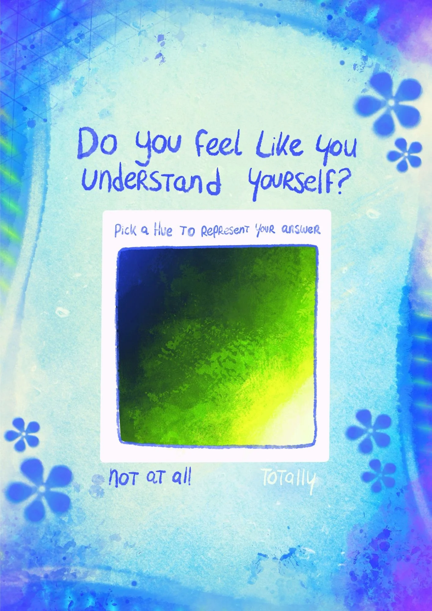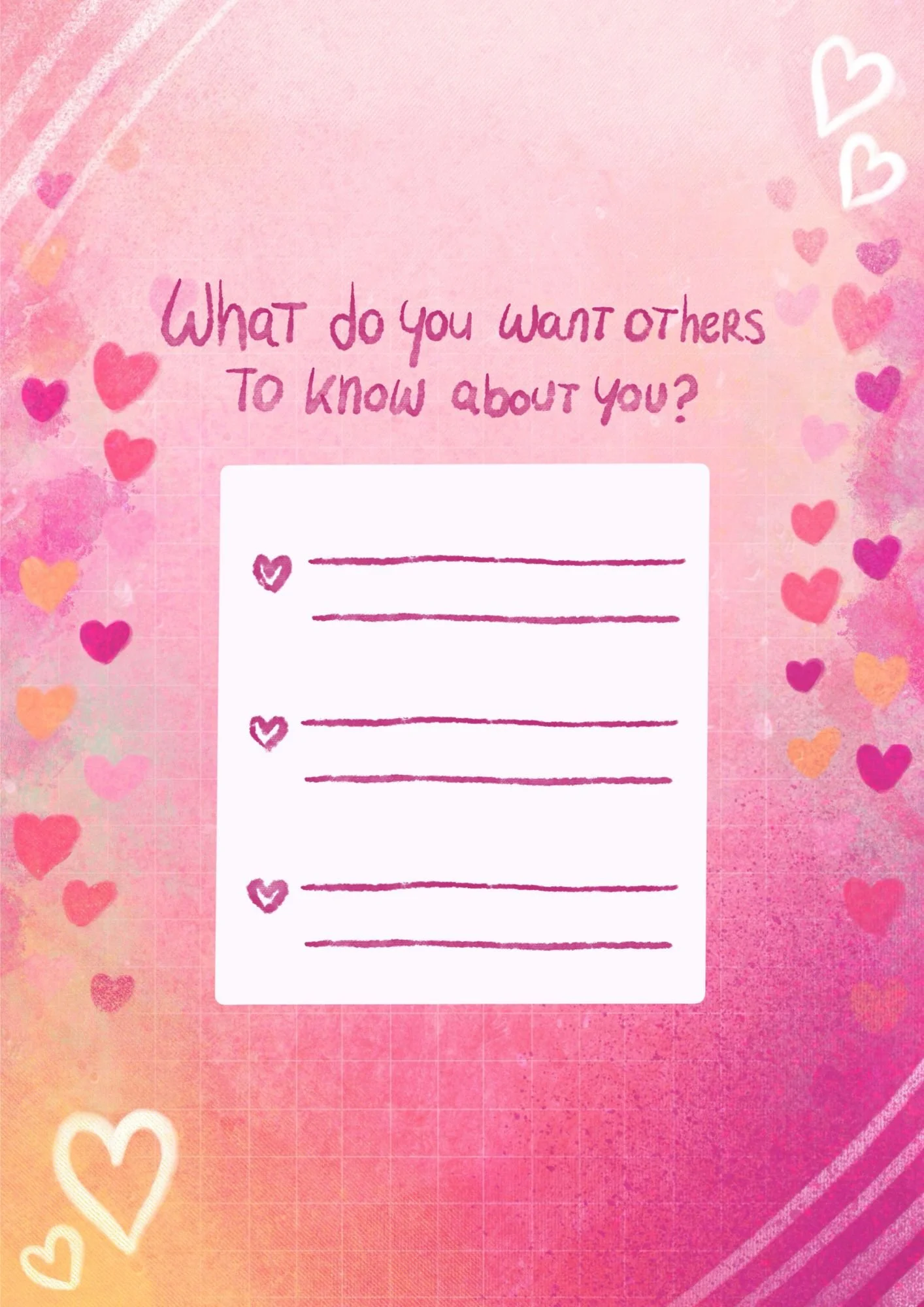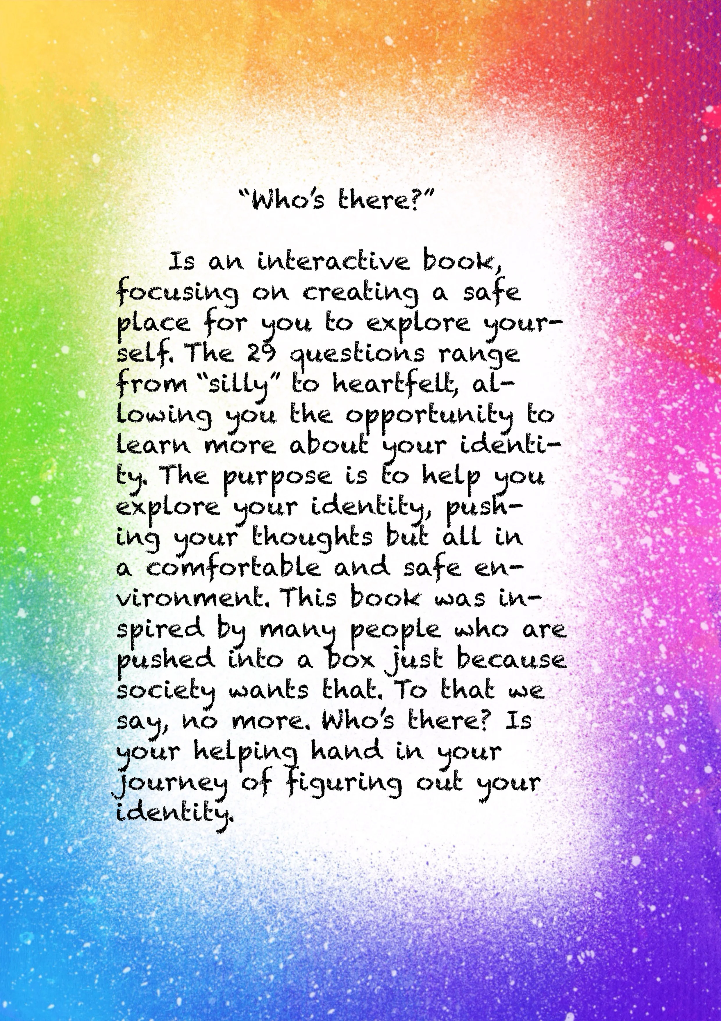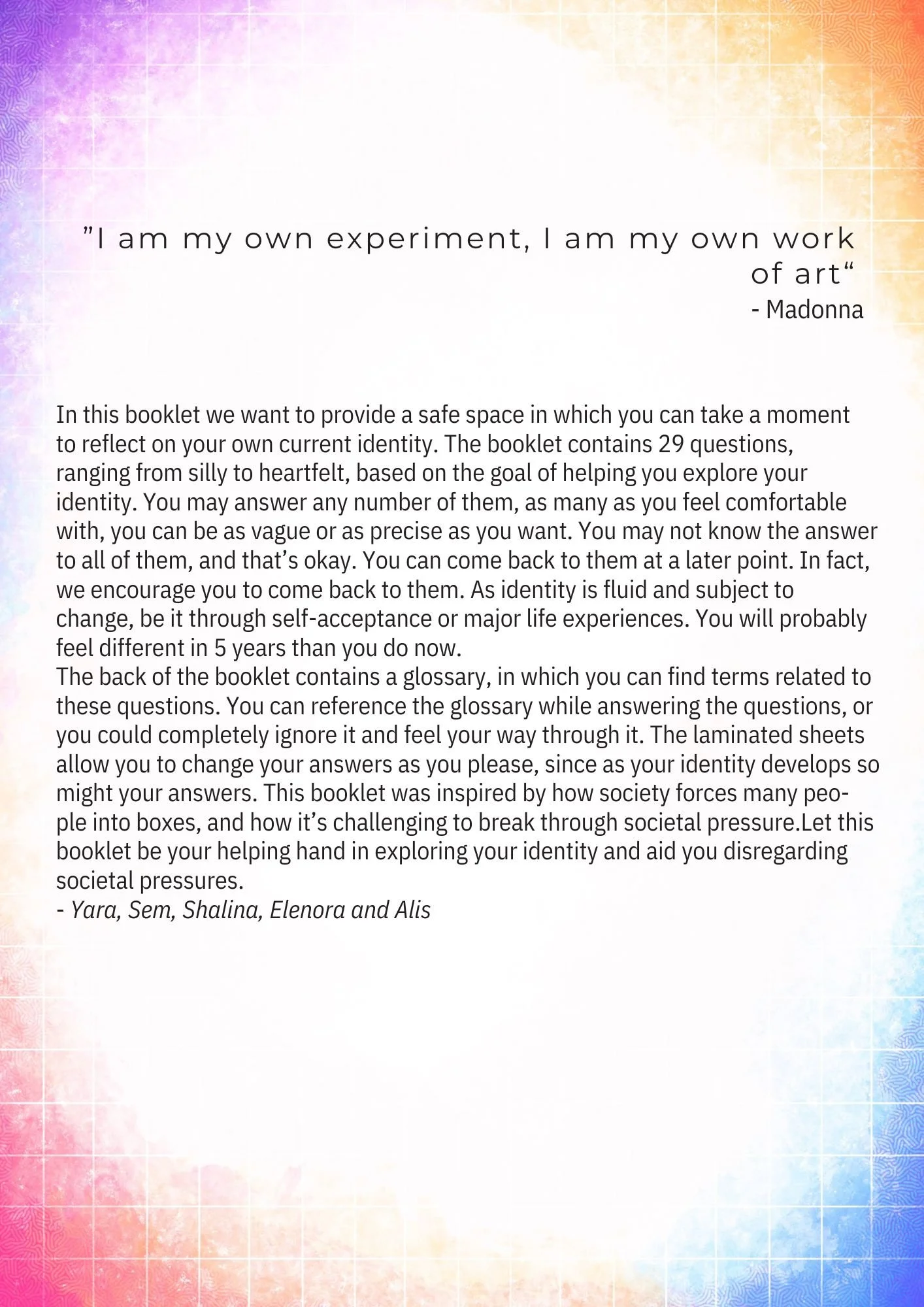 The back of the booklet contains a glossary, in which you can find terms related to these questions. You can reference the glossary while answering the questions, or you could completely ignore it and feel your way through it. The laminated sheets allow you to change your answers as you please, since as your identity develops so might your answers. This booklet was inspired by how society forces many people into boxes, and how it's challenging to break through societal pressure.Let this booklet be your helping hand in exploring your identity and aid you disregarding societal pressures. - Yara, Sem, Shalina, Elenora and Alis