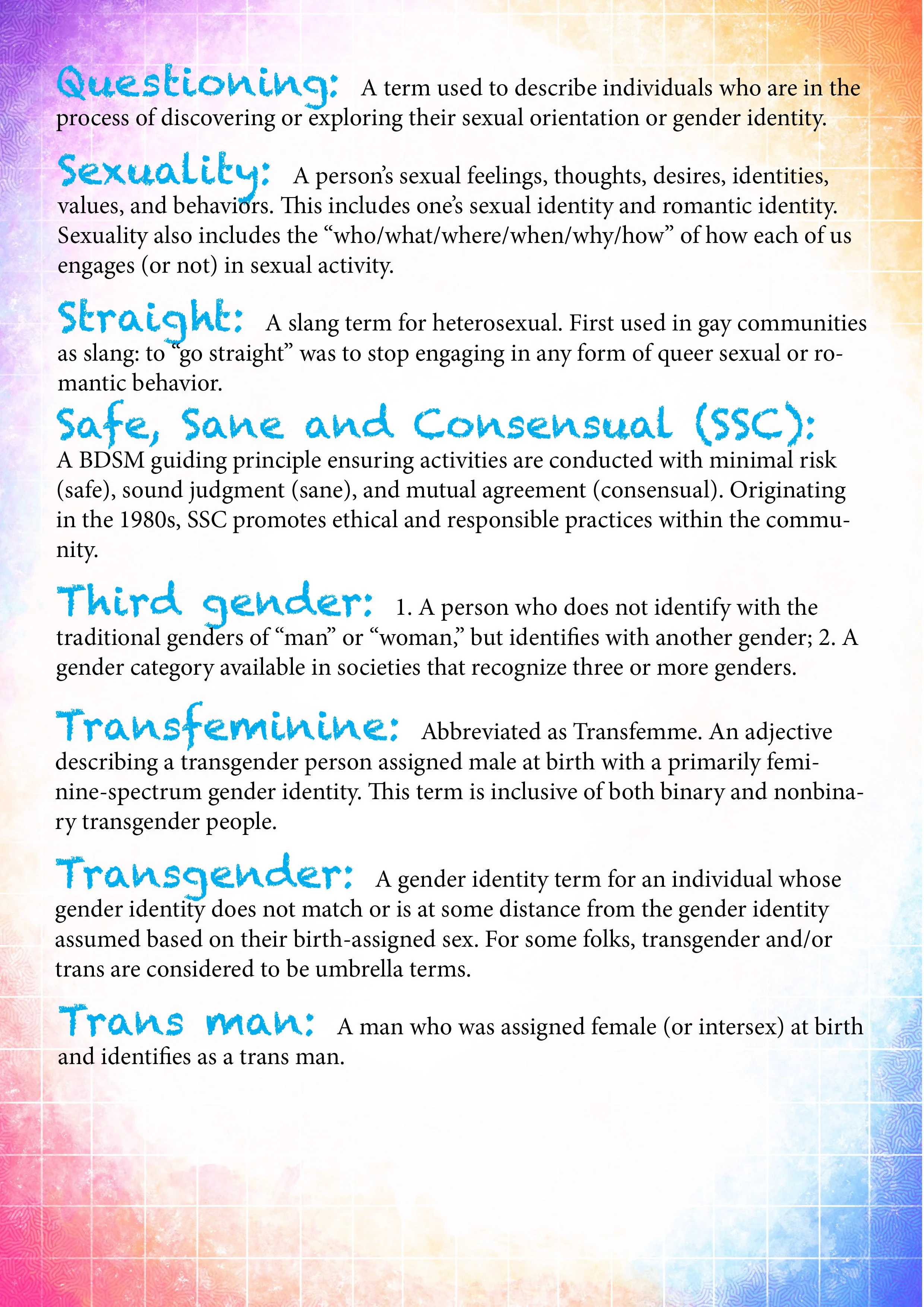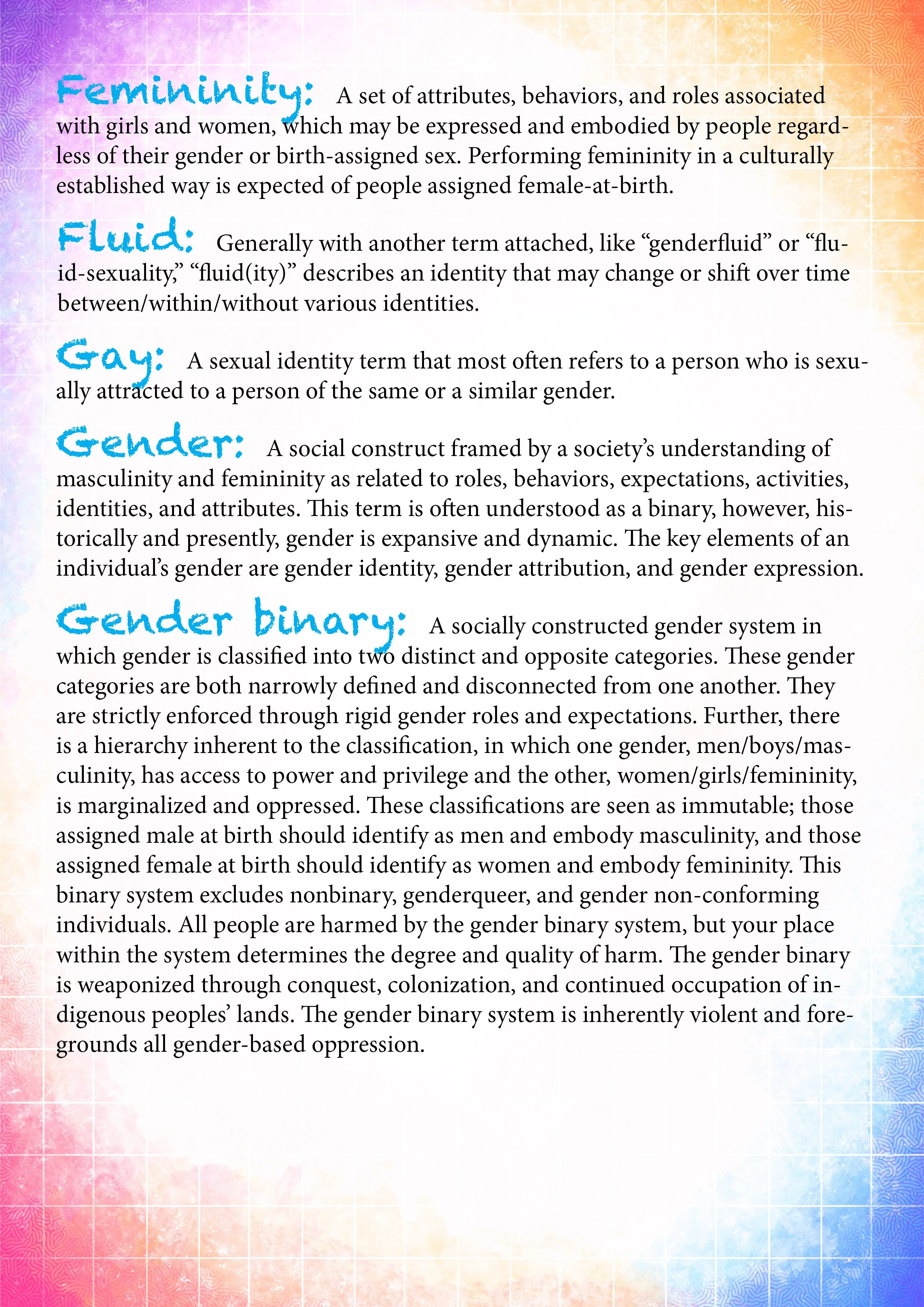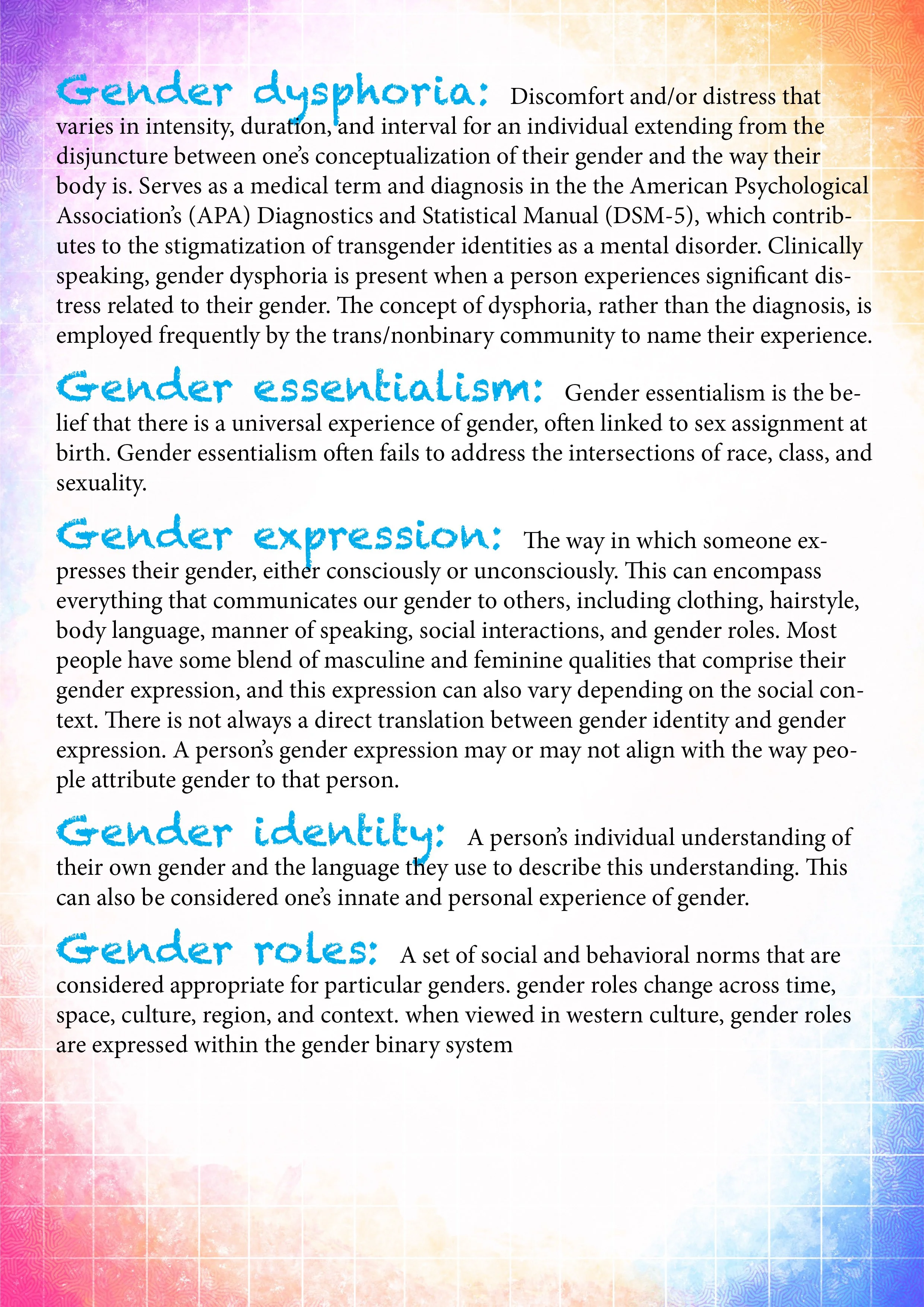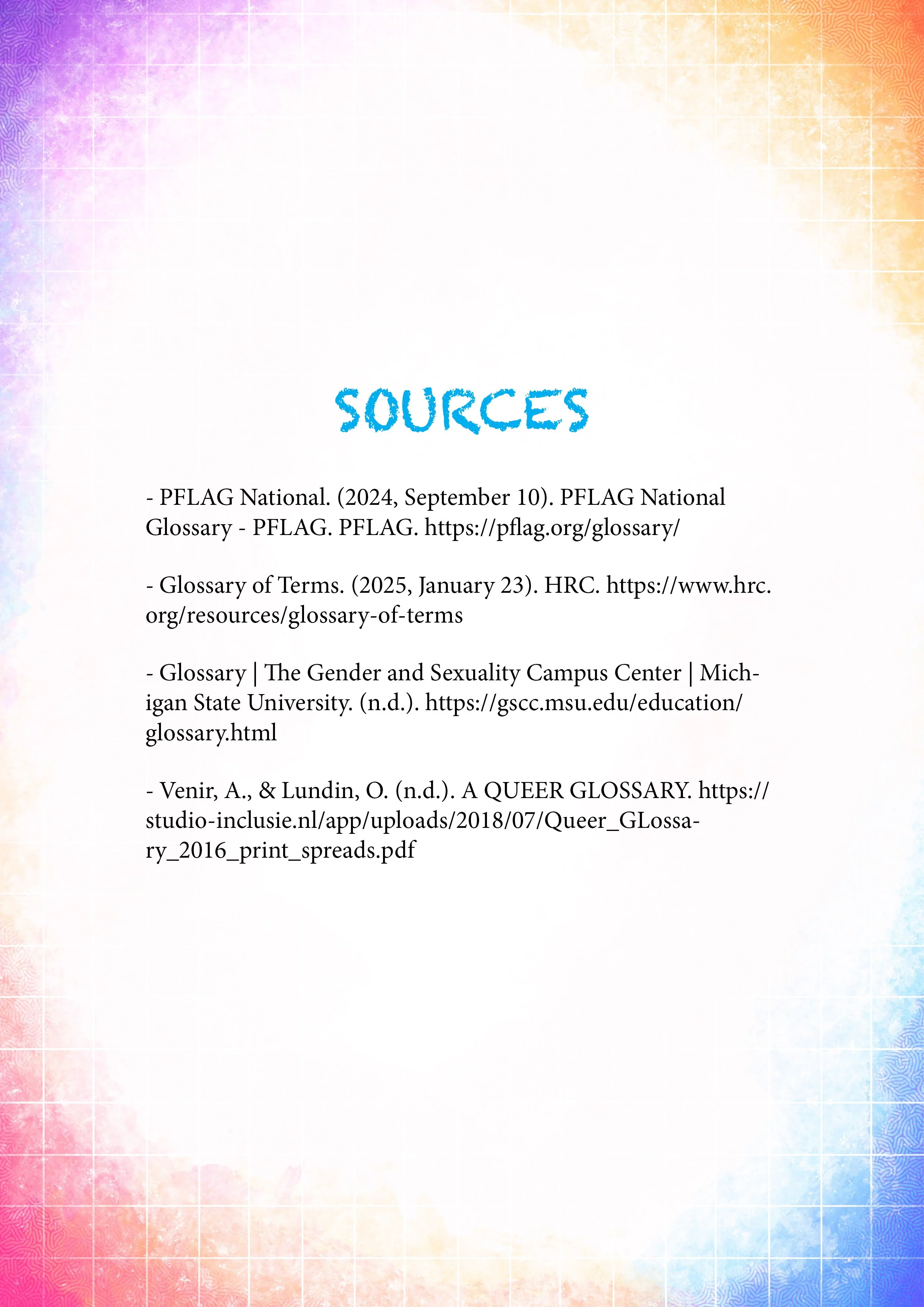 The back of the booklet contains a glossary, in which you can find terms related to these questions. You can reference the glossary while answering the questions, or you could completely ignore it and feel your way through it. The laminated sheets allow you to change your answers as you please, since as your identity develops so might your answers. This booklet was inspired by how society forces many people into boxes, and how it's challenging to break through societal pressure.Let this booklet be your helping hand in exploring your identity and aid you disregarding societal pressures. - Yara, Sem, Shalina, Elenora and Alis