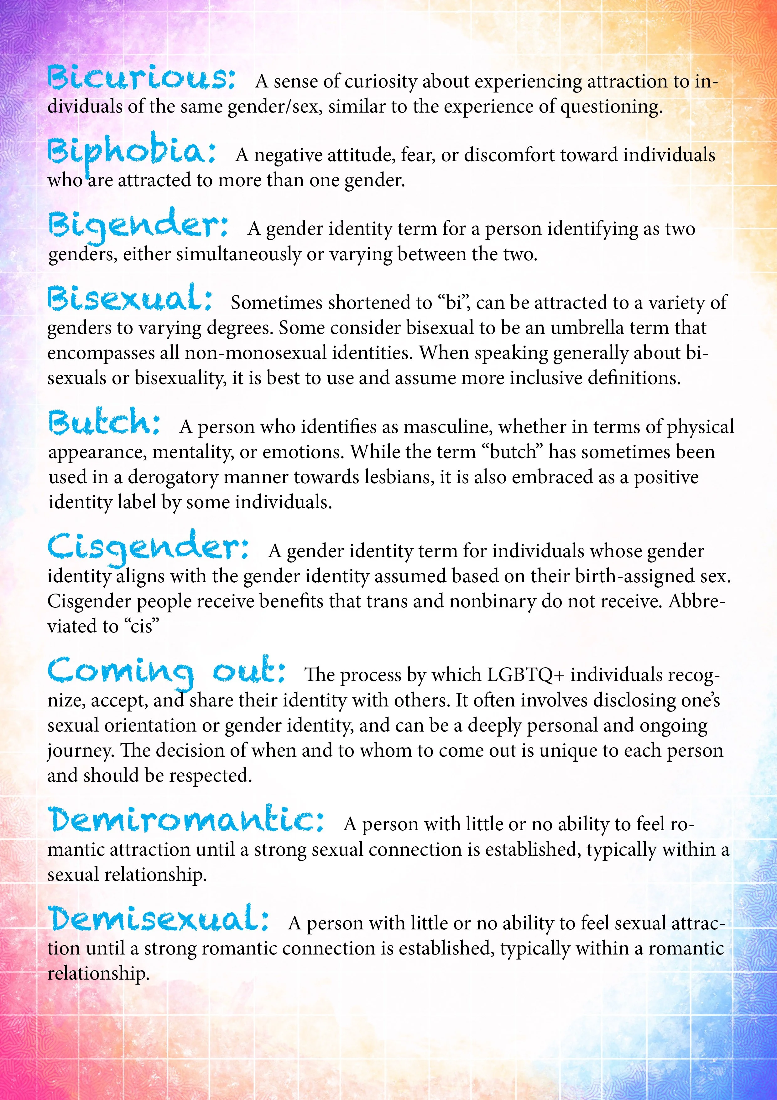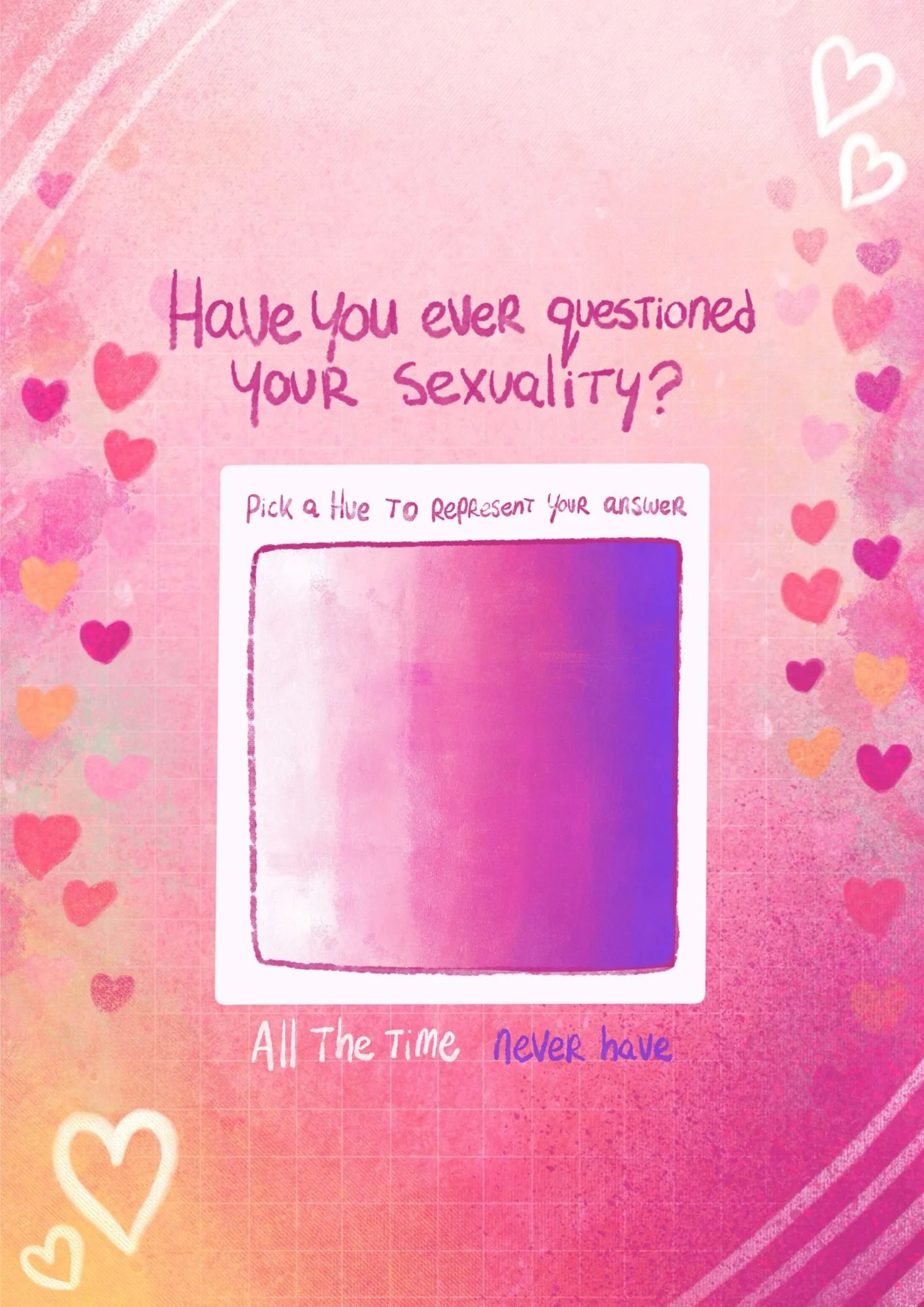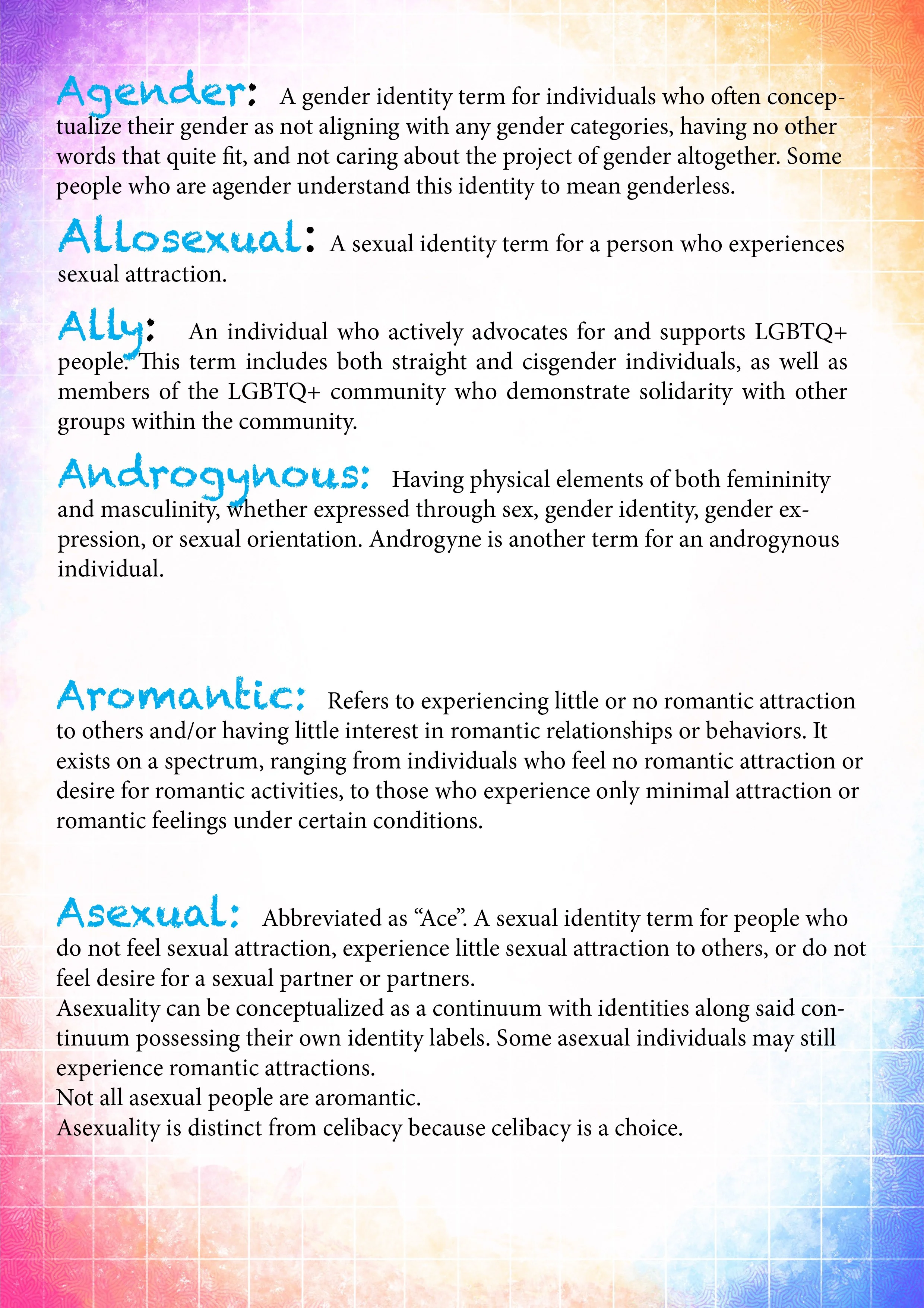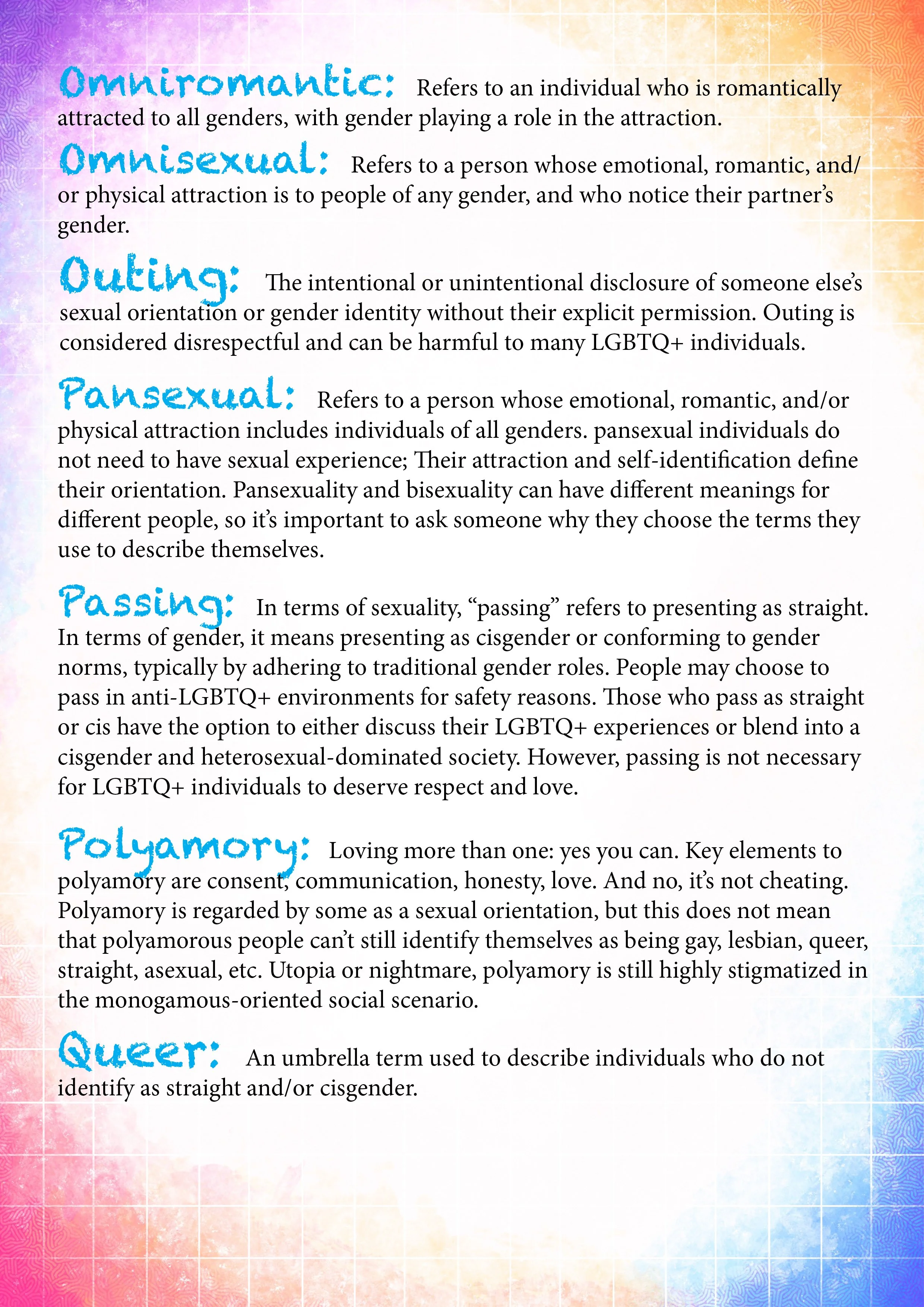 The back of the booklet contains a glossary, in which you can find terms related to these questions. You can reference the glossary while answering the questions, or you could completely ignore it and feel your way through it. The laminated sheets allow you to change your answers as you please, since as your identity develops so might your answers. This booklet was inspired by how society forces many people into boxes, and how it's challenging to break through societal pressure.Let this booklet be your helping hand in exploring your identity and aid you disregarding societal pressures. - Yara, Sem, Shalina, Elenora and Alis