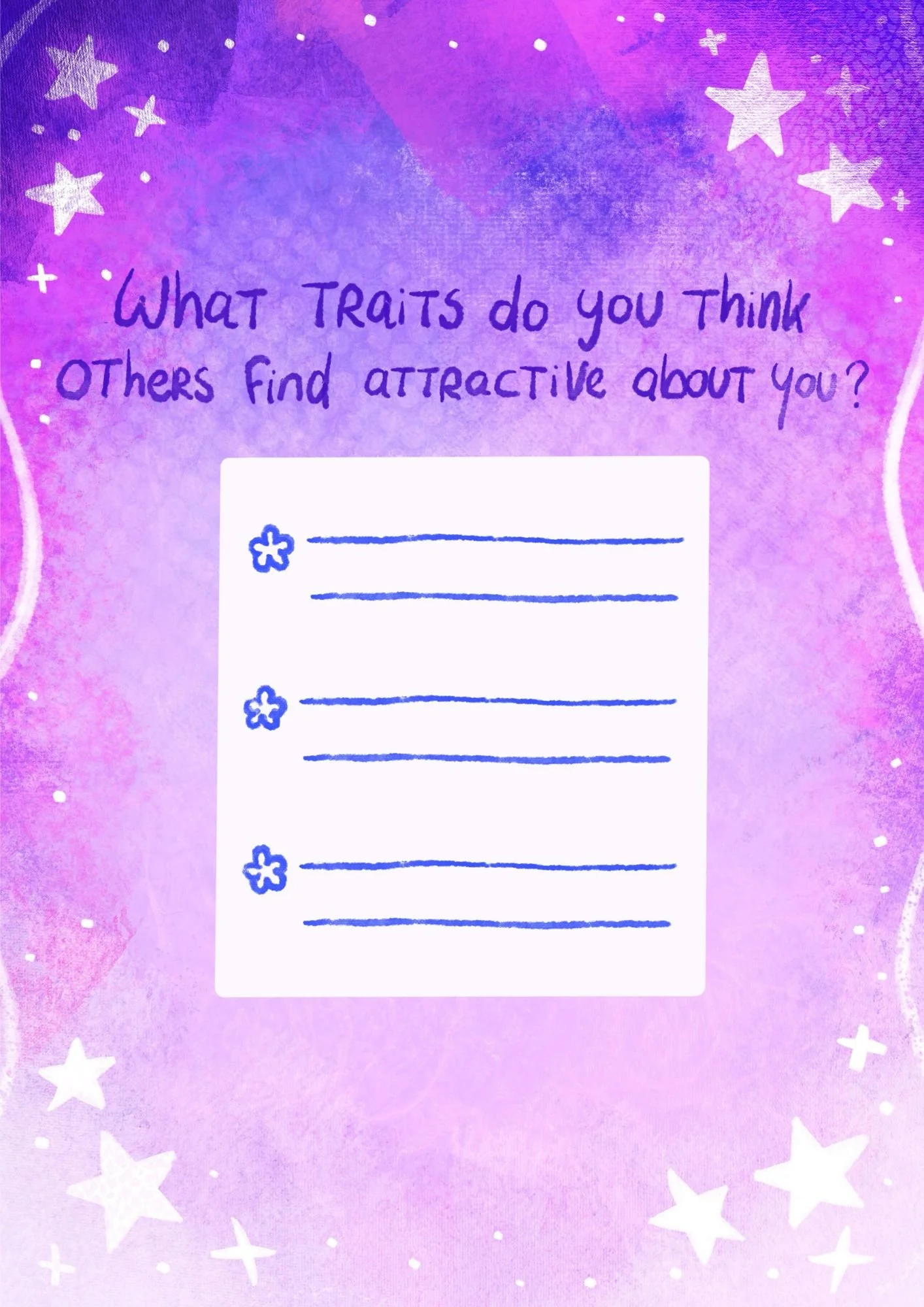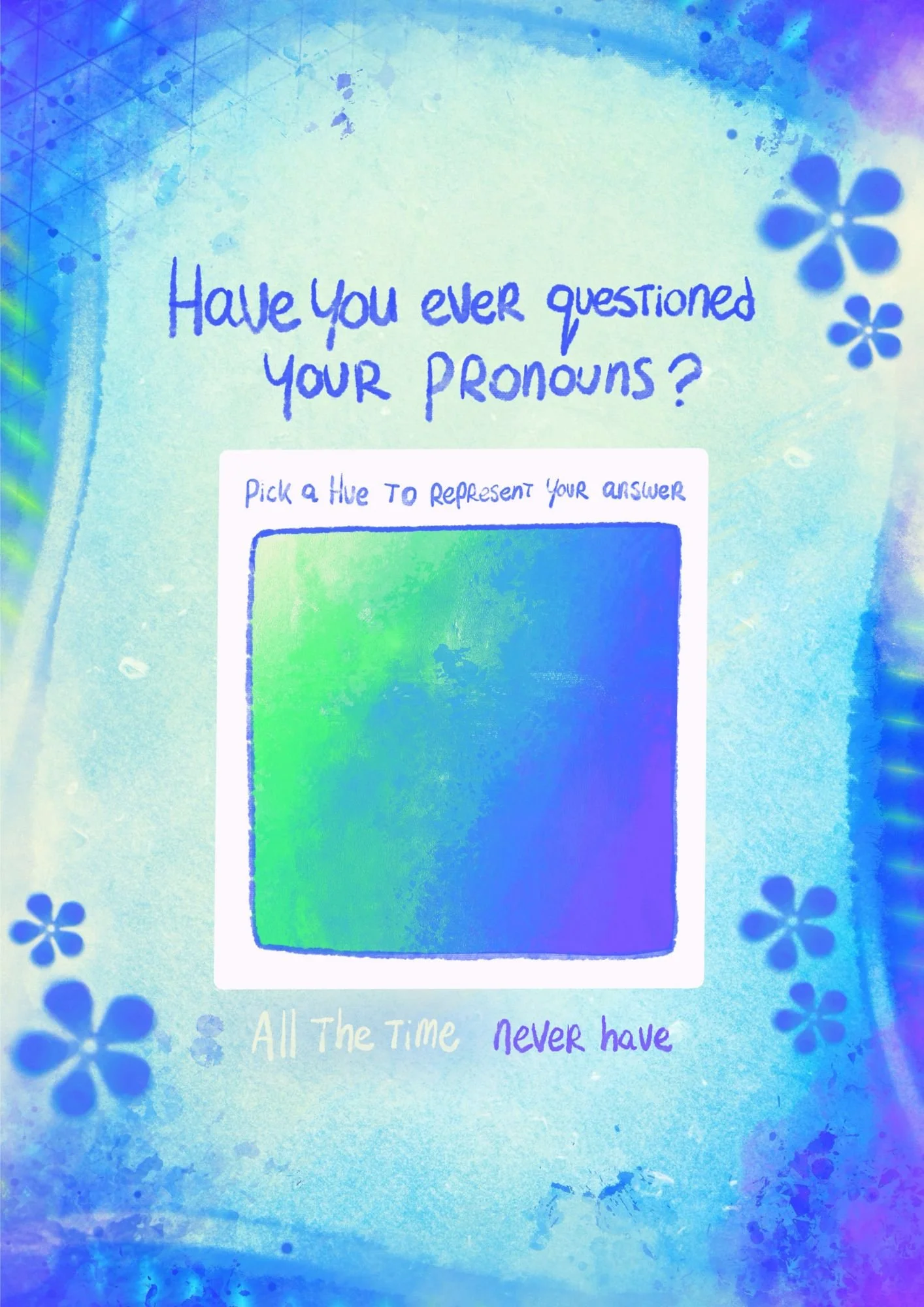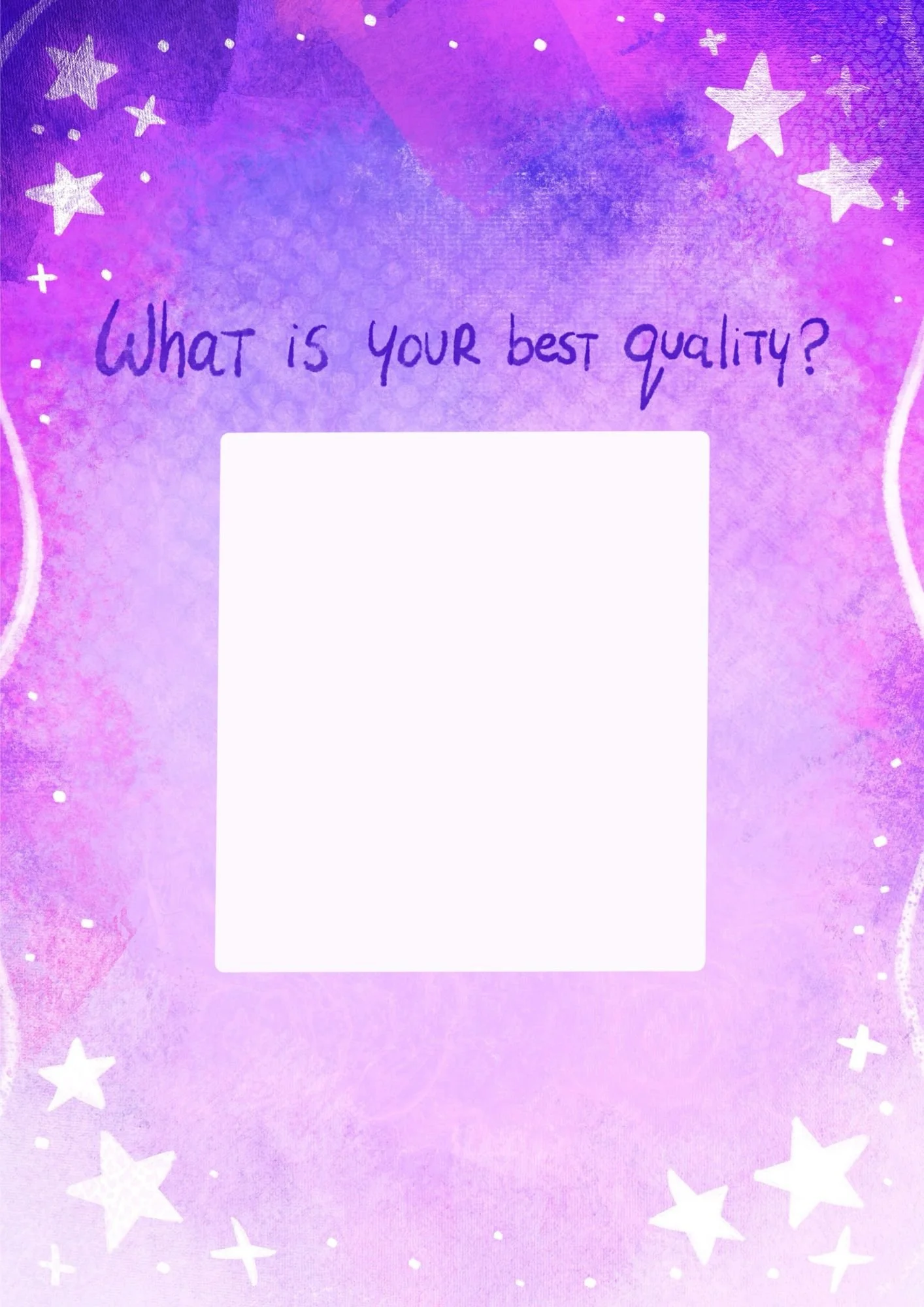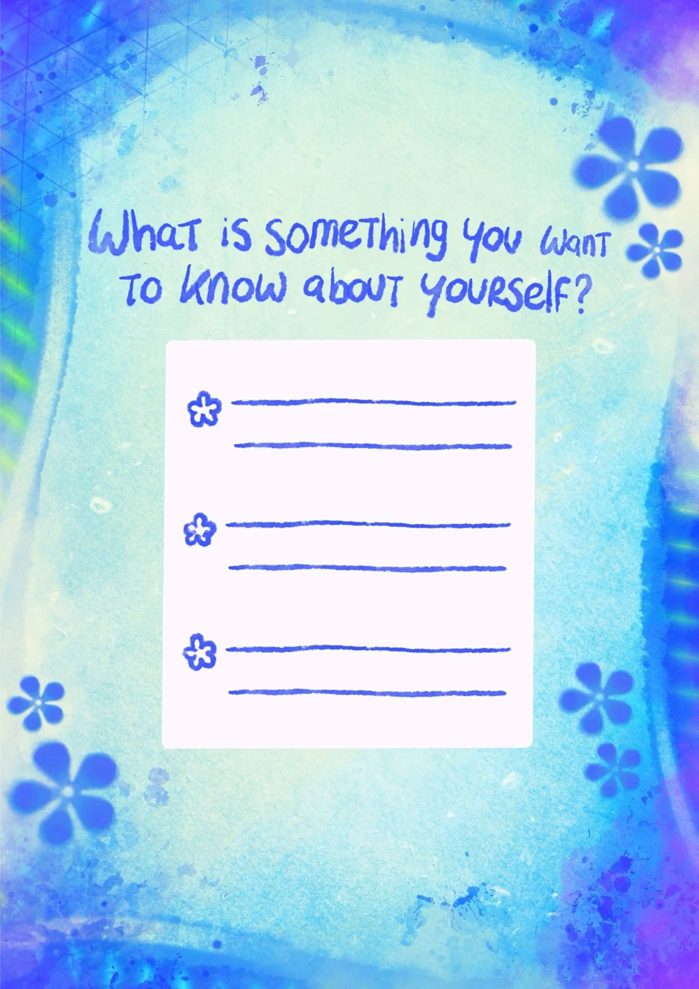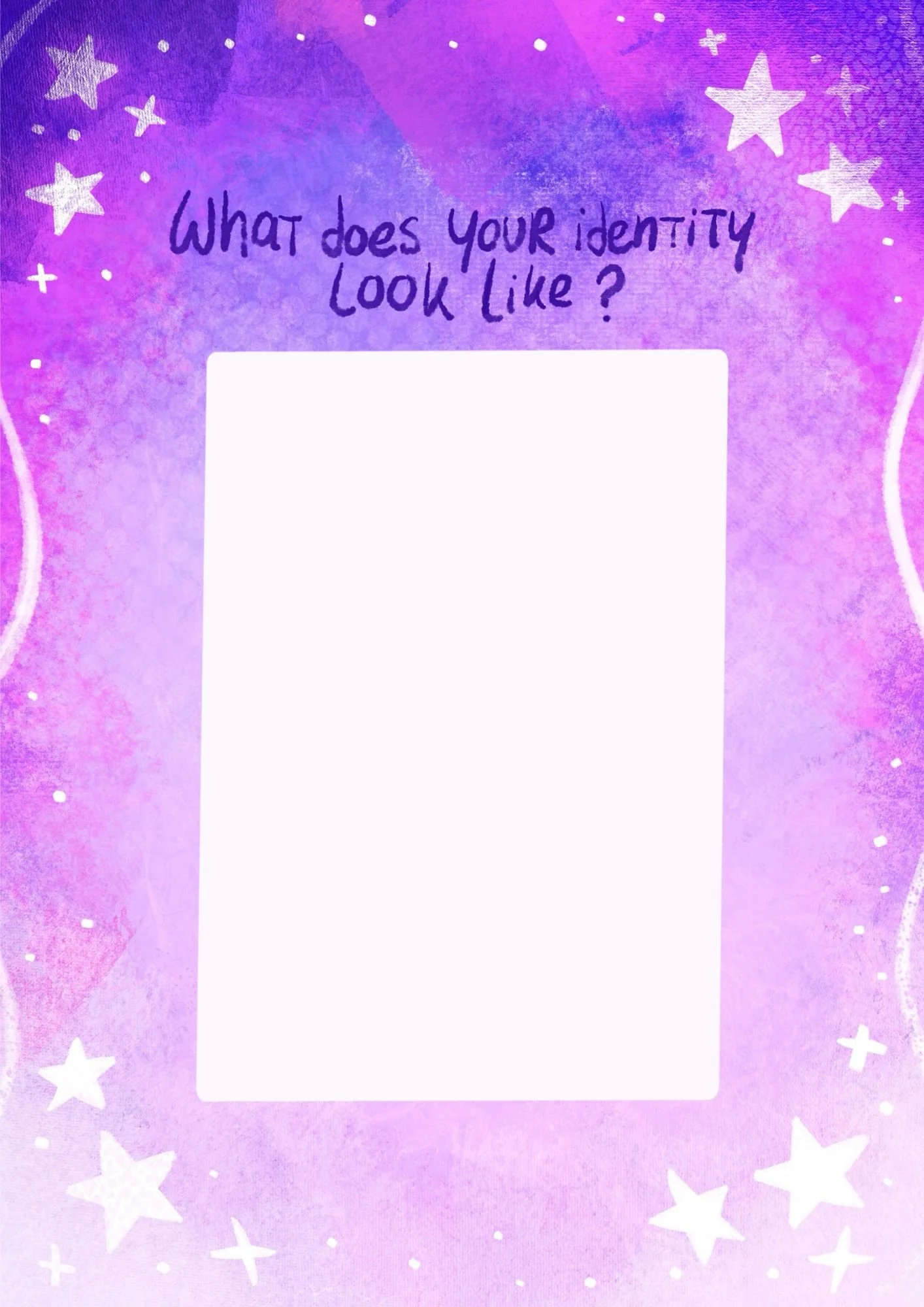 In this booklet we want to provide a safe space in which you can take a moment to reflect on your own current identity. The booklet contains 29 questions, ranging from silly to heartfelt, based on the goal of helping you explore your identity. You may answer any number of them, as many as you feel comfortable with, you can be as vague or as precise as you want. You may not know the answer to all of them, and that's okay. You can come back to them at a later point. In fact, we encourage you to come back to them. As identity is fluid and subject to change, be it through self-acceptance or major life experiences. You will probably feel different in 5 years than you do now.
